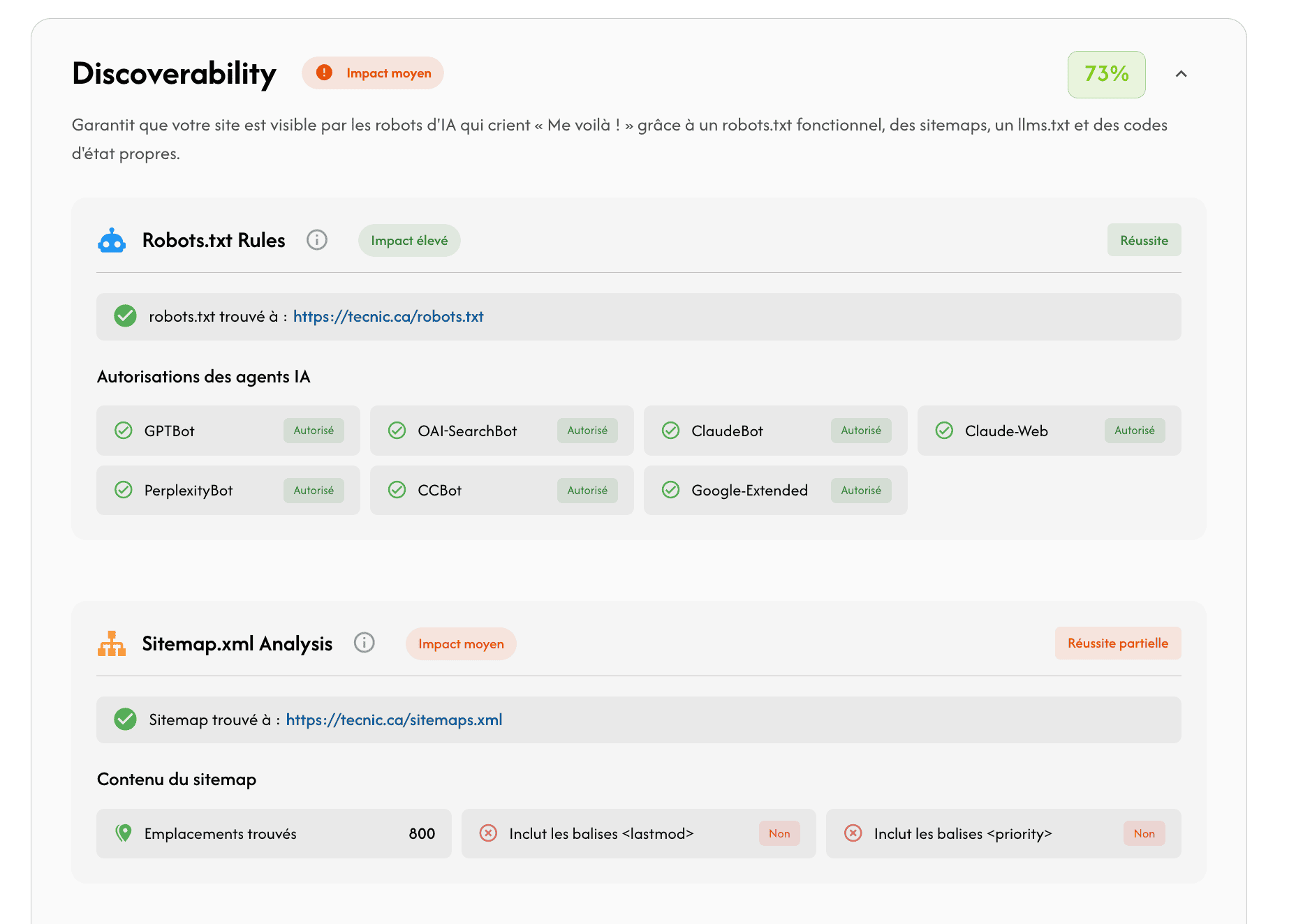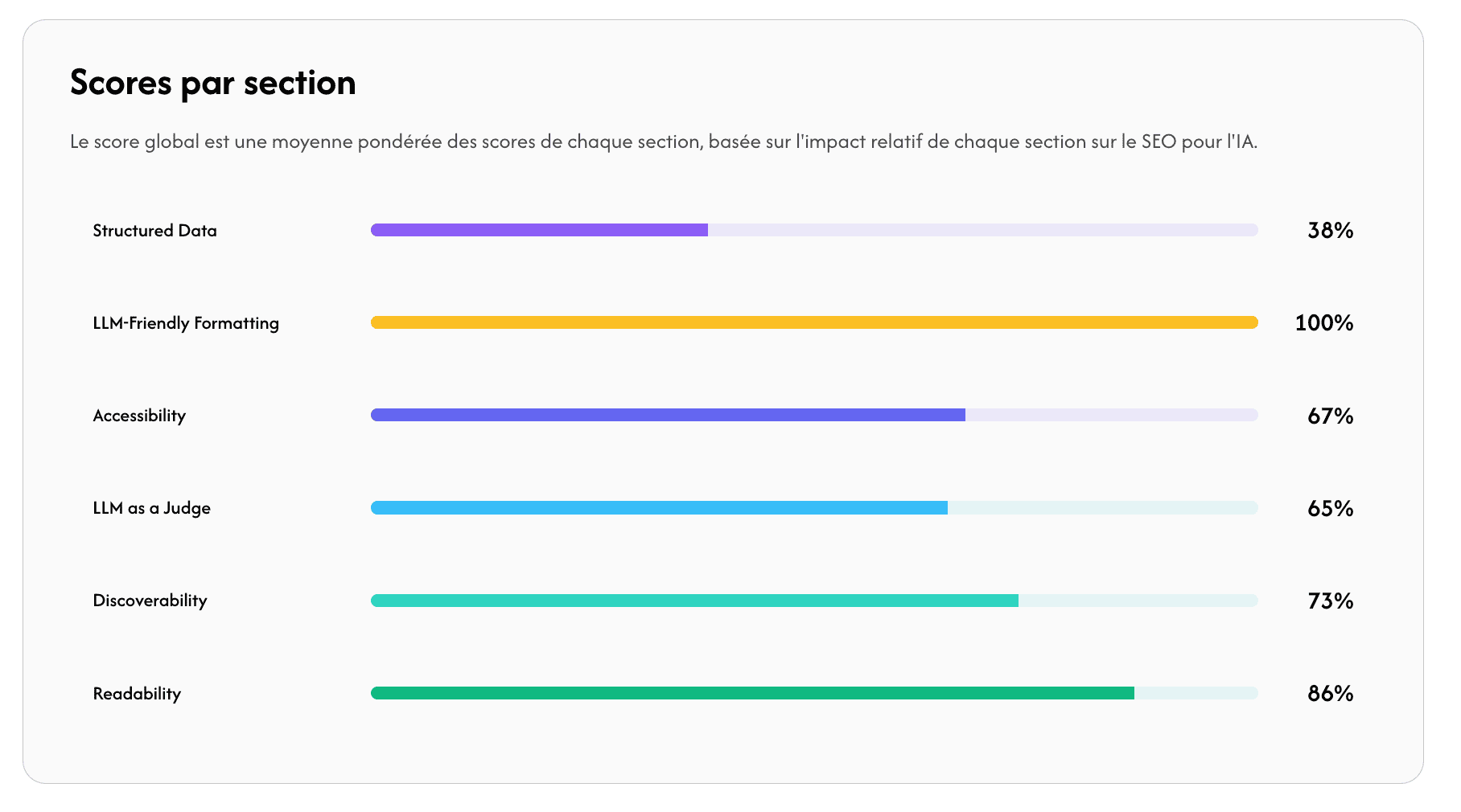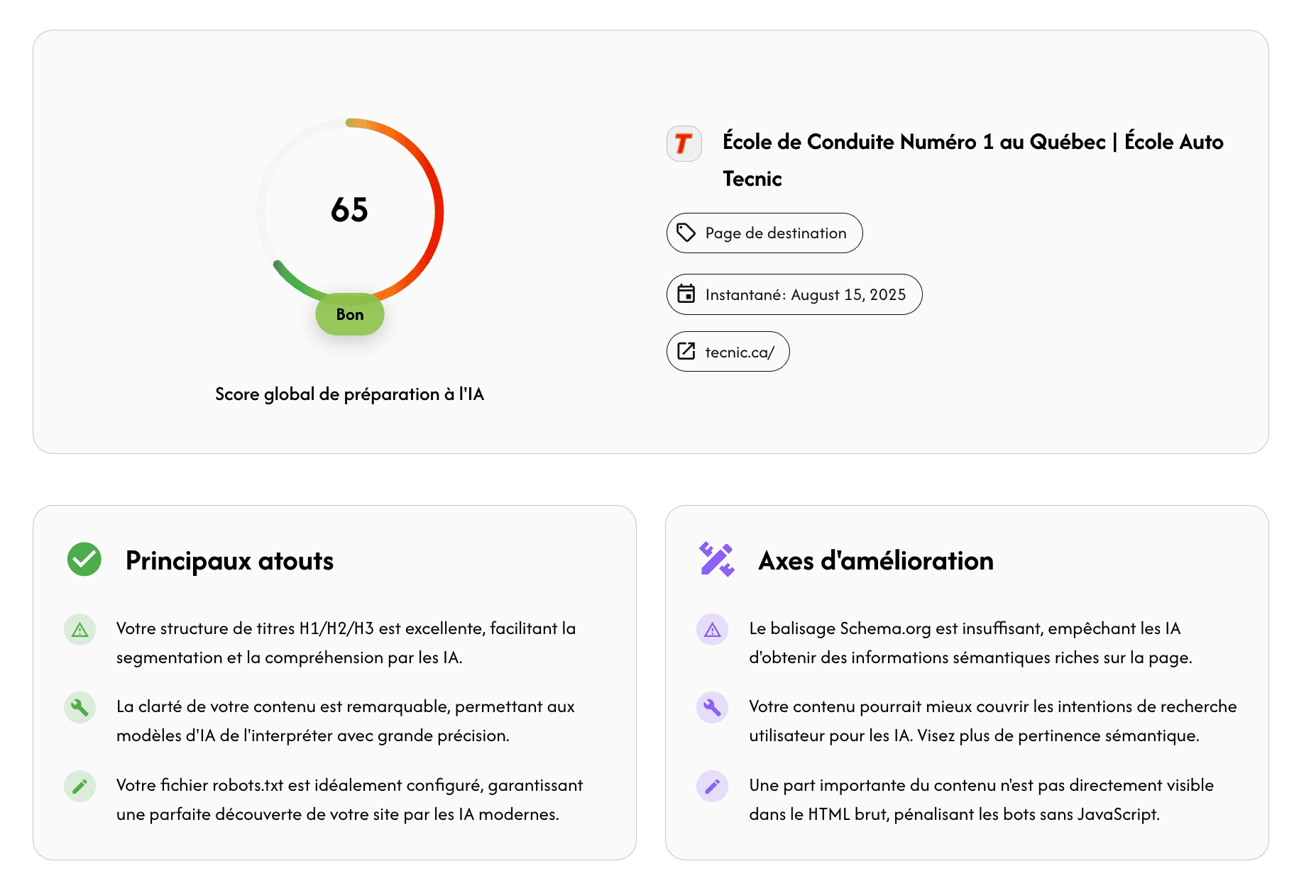 Découvrez en quelques minutes si votre site est réellement lisible et exploitable par les moteurs d’intelligence artificielle (ChatGPT, Claude, Perplexity).